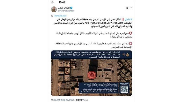 Öte yandan İsrail Ordu Sözcüsü Avichay Adraee, sosyal medya platformu X’teki hesabından yaptığı paylaşımda, Gazze’deki bazı noktalar için saldırı öncesi tahliye uyarısı yayımladı.