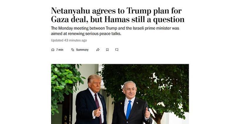 ABD basınından Washington Post, “Netanyahu, Trump’ın Gazze anlaşması planını kabul etti ancak Hamas hala bir soru işareti” başlığıyla görüşmeyi duyurdu. Haberde bu planın “Beyaz Saray’ın iki yıldır devam eden acımasız savaşı sona erdirme yönündeki çabalarının bir yansıması olduğu” belirtilirken “Barışa gidilen yol için Hamas’ın onayı gerekli” ifadeleri kullanıldı. Haberde ayrıca Mısırlı üst düzey bir yetkilinin de söylemlerine yer verilerek “Herkes neler olup bittiğini, Netanyahu’nun neyi onaylayıp neye hayır diyeceğini görmek için bekliyor. Böylece Mısır’ın bu Amerikan önerisine yönelik vizyonu hakkında tam bir fikir verebiliriz”denildi.