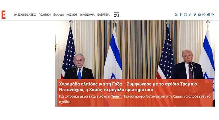 Yunan basınından iEidiseis ise görüşmeyi “Gazze için bir umut ışığı” başlığıyla aktarırken Trump’ın “Bugün büyük, çok büyük bir gün, belki de medeniyet tarihinin en büyüklerinden biri” ifadelerine yer verildi. Ancak tüm bunlara rağmen Hamas’ın henüz yanıt vermediğine dikkat çekilen haberde Netanyahu’nun “Sayın Başkan, Hamas sizin planınızı reddederse veya sözde kabul eder ve ardından onu baltalamak için her şeyi yaparsa, İsrail görevi kendi başına tamamlayacaktır” ifadeleri kullanıldı.