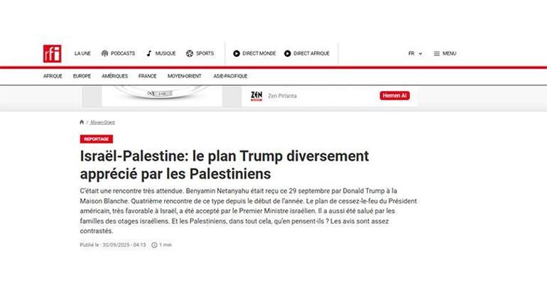 Fransız basınından RFI ise “Trump’ın planı Filistinliler arasında karışık eleştiriler alıyor” başlıklı haberinde Al Jazeera’ya konuşan Filistinlilerin söylemlerine yer verdi. Haberde Filistinlilerin açıklanan plan sonrasında “Hiçbir şeyi değiştiremeyecekler, bunların hepsi uydurma” dedikleri ifade edildi.
